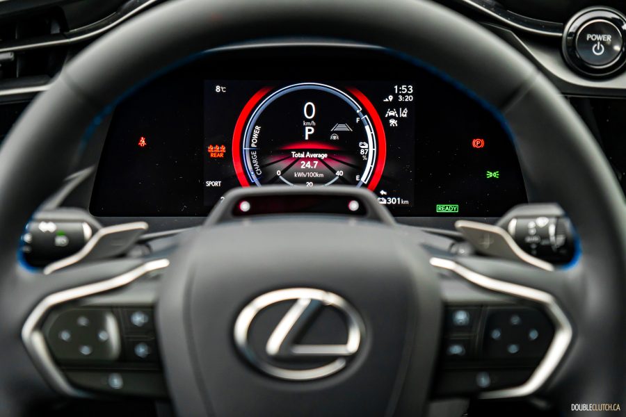 Admittedly, this isn’t really new, either: Hyundai very famously did it first, and fabulously well. This system works in much the same way, using steering wheel mounted paddles and sharp breaks in momentum to simulate the action of shifting, and indeed the feel of a powertrain at all. It has a powerband of sorts, building towards the top of its simulated rev range, and falling off above that, before running up against its redline and abruptly halting. A note on that: Lexus will let you do it wrong. You can drive it all day long at 46 km/h, foot floored, pinging off the rev limiter, if you resist shifting out of “first gear.” If you select the next gear while still floored you’ll be jolted into your seat, and jolted out when you butt up against the limiter again. Conversely, if you try to take off while being in too high of a gear and too low of “revs,” it will bog and barely accelerate until it either builds some steam or until you shift down. It won’t correct you, but instead intuitively nudge you towards doing it right with its numberless tachometer and the obvious reward of abundant, smooth power delivery if done properly. You know, like a fun car.