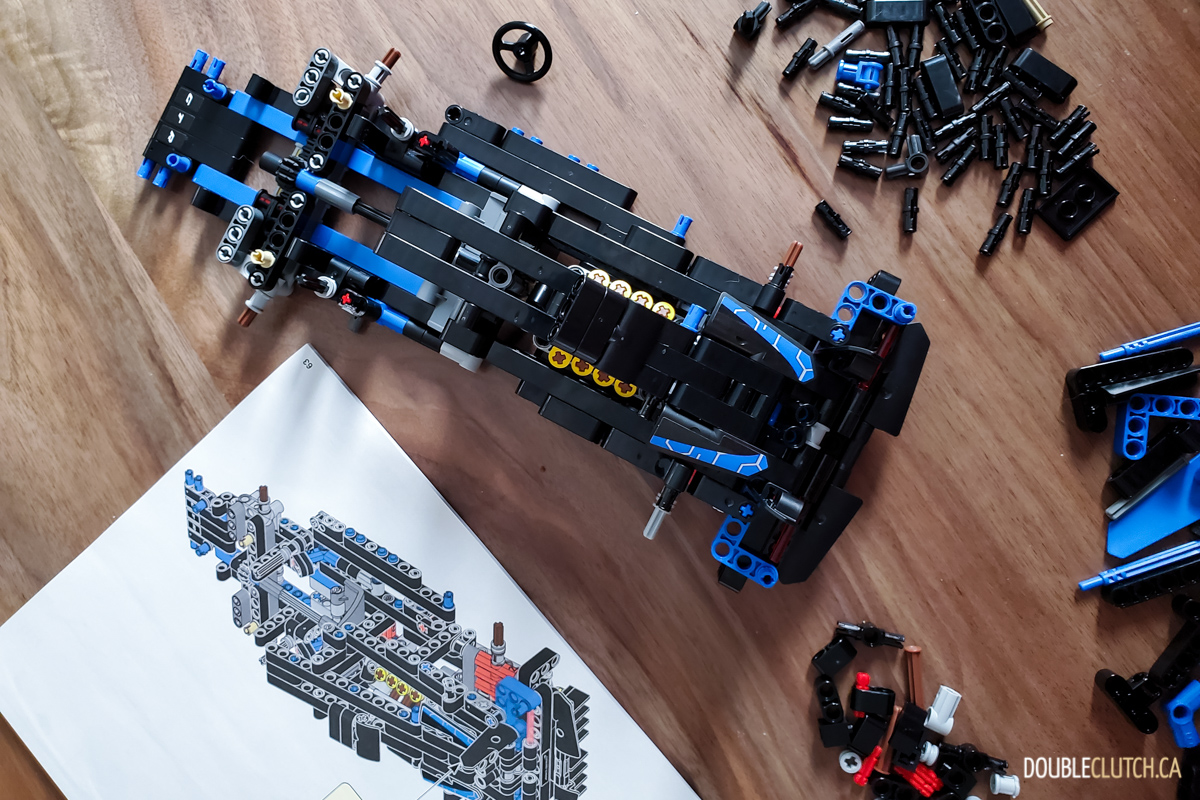 The first stage involved assembling the chassis and drivetrain, which includes an engine with firing pistons, and a functional steering rack. The pistons are particularly cool, and maintain firing order as you spin the rear axle - (take special care in assembling this portion as I mucked it up with one poorly placed piece and had to use some wizardry to fix my mistake without taking the whole thing apart).